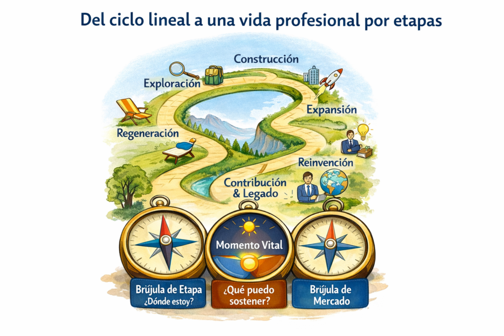 Cuando estas tres brújulas se alinean, aparecen transiciones sostenibles. Cuando chocan, surgen carreras agotadoras, cambios fallidos o salidas forzadas: expansión cuando toca regenerar, reinvención sin energía, o insistencia en roles que el mercado ya no demanda.