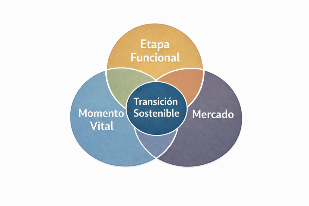 Durante años se habló de alinear “lo que quiero” con “lo que pide el mercado”. En longevidad eso ya no basta. La decisión profesional inteligente necesita una triple brújula, porque la etapa funcional profesional en la que estás define el tipo de paso adecuado.